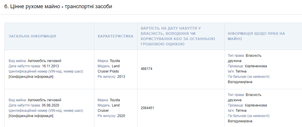 Кроме того в прошлом году Корявченкова купила автомобиль Toyota Land Cruiser за 2,084451 гривен.