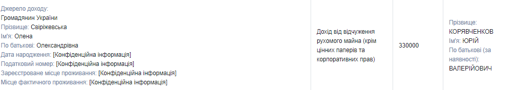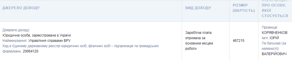 Муж Корявченковой, по данным из декларации, заработал в управлении делами Верховной Рады Украины - 467 215 тыс. грн, еще 330 000 он получил в качестве дохода от отчуждения движимого имущества.