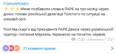 "Меня лишили слова в ПАСЕ на три месяца из-за доноса председателя российской делегации Толстого по ситуации на зимней сессии. Рассмотрение жалобы от президента ПАСЕ Дамса из-за украинского флага и вопроса Меркель перенесли на начало июня", - написал Гоначренко.