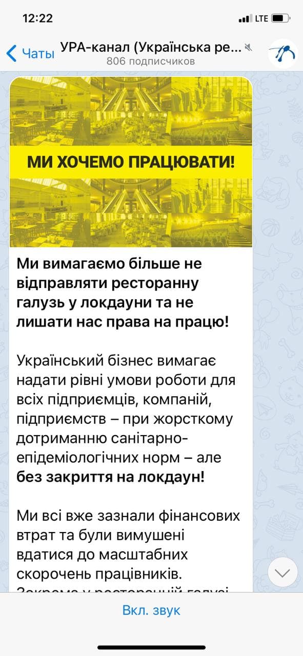 Украинская ресторанная ассоциация присоединилась к всеукраинскому флешмобу "Мы хотим работать", который стартовал в среду, 28 апреля.