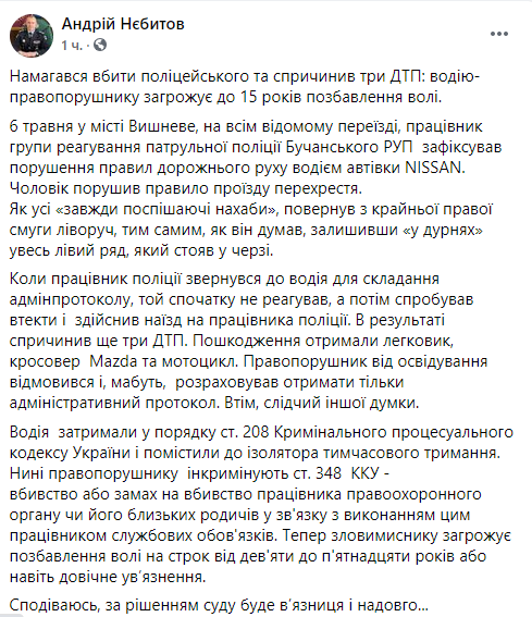 Об этом сообщил начальник полиции Киевской области Андрей Небытов на своей странице в Facebook в пятницу, 7 мая.