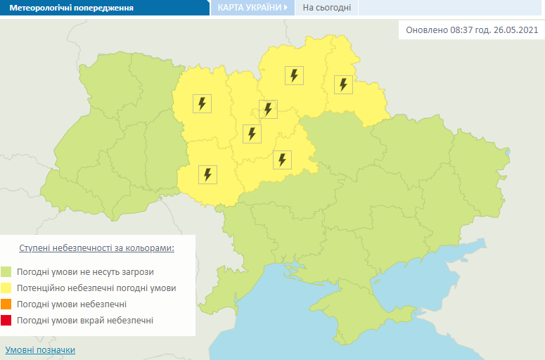 В среду, 26 мая, в Киеве и еще в шести регионах Украины из-за ухудшения погодных условий объявлено штормовое предупреждение. Определен первый уровень опасности, желтый.