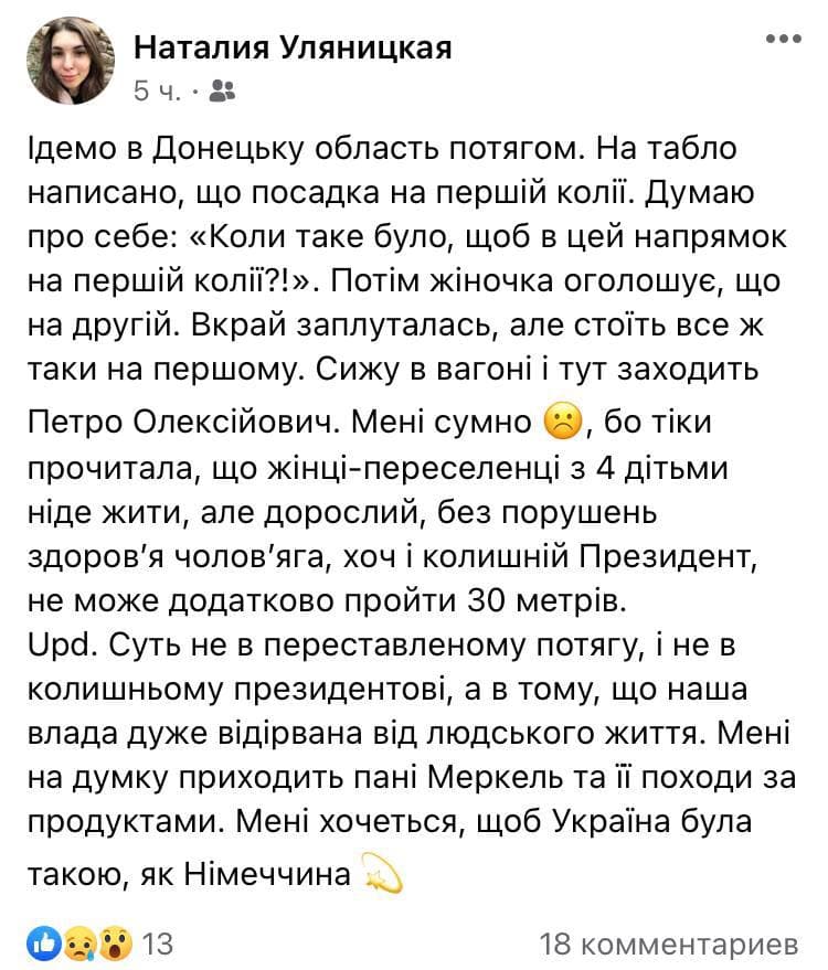 "Едем в Донецкую область поездом. На табло написано, что посадка на первый путь. Думаю про себя: "Когда такое было, чтобы в этом направлении и на первый путь?. Потом женщина объявляет, что на вторую. Вконец запуталась, но стоит все-таки на первой (поезд, - Ред.) Сижу в вагоне, и тут заходит Петр Алексеевич", - описывает произошедшее девушка.