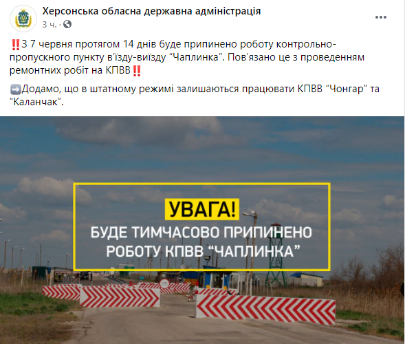 "С 7 июня в течение 14 дней будет прекращена работа контрольно-пропускного пункта въезда-выезда "Чаплинка". Связано это с проведением ремонтных работ на КПВВ", - говорится в сообщении пресс-служба Херсонской ОГА.