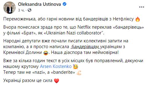 "Победа, или хорошие новости от бандеровцев из Нетфликса. Вчера понеслась зрада о том, что Netflix перевел "бандеровец" в фильме "Брат", как "Ukrainian Nazi collaborator". Народные депутаты уже начали писать коллективные запросы к компании, а я просто написала украинцам из Кремнивой Долины. Наша диаспора там невероятная!
