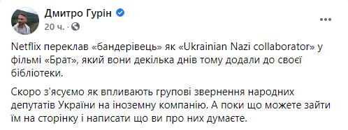 "Netflix перевел "бандеровец" как "Ukrainian Nazi collaborator" в фильме "Брат", который они несколько дней назад добавили в свою библиотеку. Скоро выясним, как влияют групповые обращения народных депутатов Украины на иностранную компанию. А пока можете зайти к ним на страницу и написать, что вы о них думаете" - написал депутат.