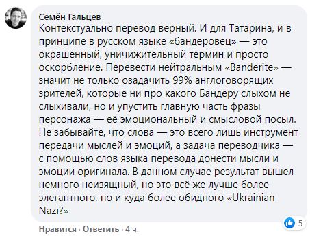 Нардеп от "Голоса" Александра Устинова написала в Фейсбуке, что напрямую обратилась к украинцам, работающим в Netflix, и теперь субтитры с "бандеровцем" перевели, как "banderite". Что с английского переводится как "бандеровец".