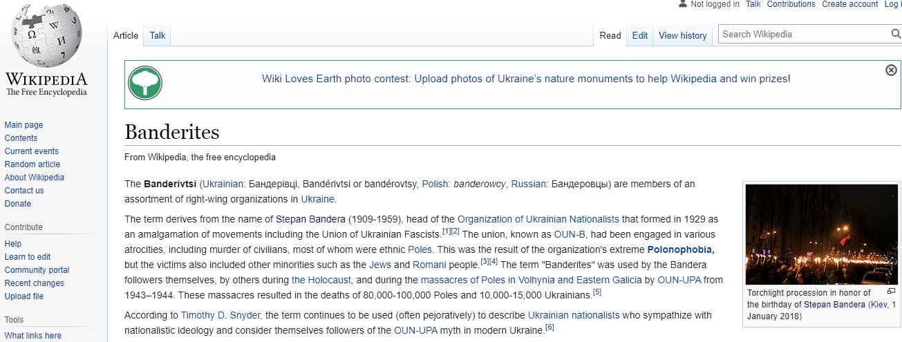 "Объединение, известное как ОУН-Б, участвовало в различных злодеяниях, включая убийства мирных жителей, большинство из которых были этническими поляками. Среди жертв также были другие меньшинства, такие как евреи и ромы", - говорится в статье Вики.