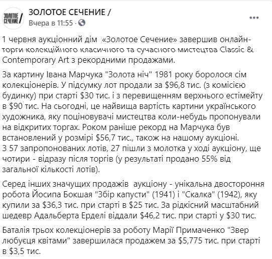 Предыдущий ценовой рекорд по изобразительному искусству украинских художников также принадлежит Ивану Марчуку. Летом 2020 года года на этом же аукционе продали его натюморт "Лодки цветом поросли", 1981 года. Картину оценили в 56,1 тысячу долларов.