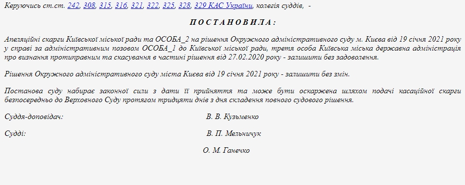 Также судьи оставили в силе отмену соответствующего решения Киевсовета, принятого в феврале 2020 года. Вердикт опубликован на сайте Единого реестра судебных решений.