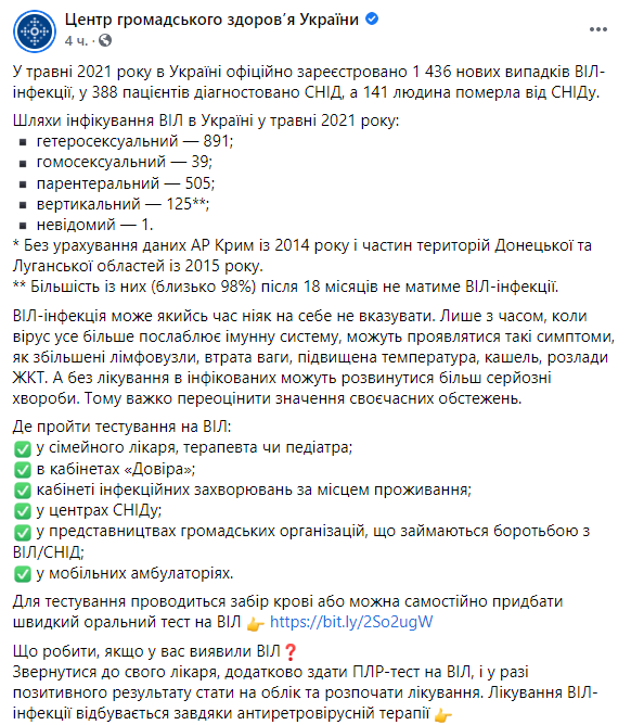 Указаны основные пути инфицирования ВИЧ в Украине в мае 2021: