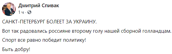 "Вот так радовались россияне второму голу нашей сборной голландцам. Спорт все равно победит политику!", - прокомментировал этот ролик украинский телеведущий Дмитрий Спивак.