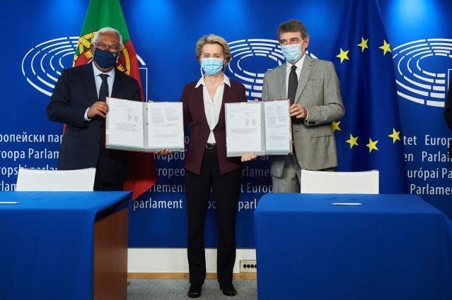 На церемонии по случаю внедрения цифровых Covid-сертификатов в ЕС присутствовали премьер-министр Португалии, председательствующей в ЕС, Антонио Коста, президент ЕС Урсула фон дер Ляйен, глава Евроарламента Давид Сассоли. Фото: ec.europa.eu