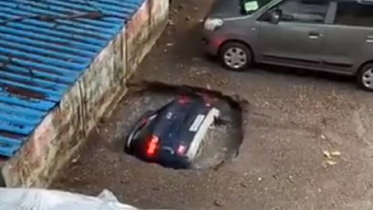 В индийском мегаполисе Мумбаи автомобиль полностью провалился под асфальт за несколько секунд. Чрезвычайное происшествие случилось после сильных проливных дождей, которые накрывают регион.