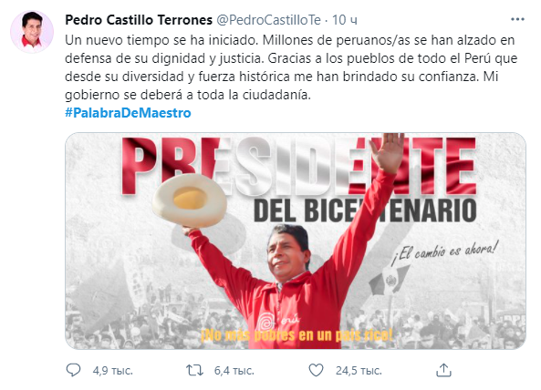 "Новое время началось. Миллионы перуанцев встали на защиту своего достоинства и справедливости. Спасибо народам всего Перу, которые в силу своего разнообразия и исторической силы оказали мне доверие. Мое правительство будет для всех граждан", - написал Кастильо в Тwitter.