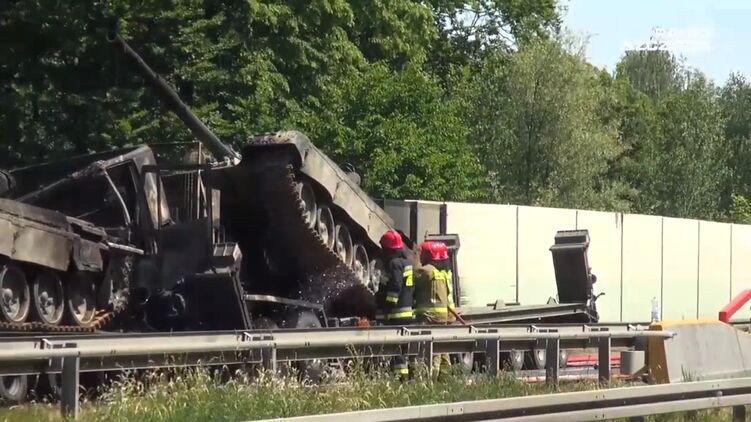 На трассе в Польше столкнулись два тягача, перевозившие танки. Военная техника сгорела