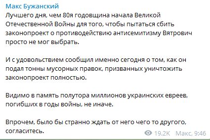 "Лучшего дня, чем 80-я годовщина начала Великой Отечественной Войны для того, чтобы пытаться сбить законопроект о противодействии антисемитизму Вятрович просто не мог выбрать.