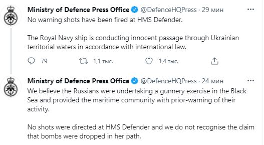 После информации об инциденте в пресс-службе британского министерства обороны сообщили, что "Дефендер" совершал "мирный проход" через украинское территориальные воды. Предупредительного огня никто не вел, бомб не сбрасывал, а ВМФ России проводил артиллерийские учения в Черном море.