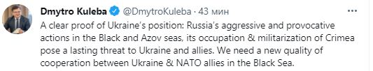 "Наглядное доказательство украинской позиции: агрессивная и провокационная политика РФ в Черном и Азовском морях, оккупация и милитаризация Крыму составляют постоянную угрозу Украине и союзникам. Именно поэтому я подчеркиваю, что необходимо качественно новое взаимодействие НАТО с Украиной в Черном море", - написал Кулеба.