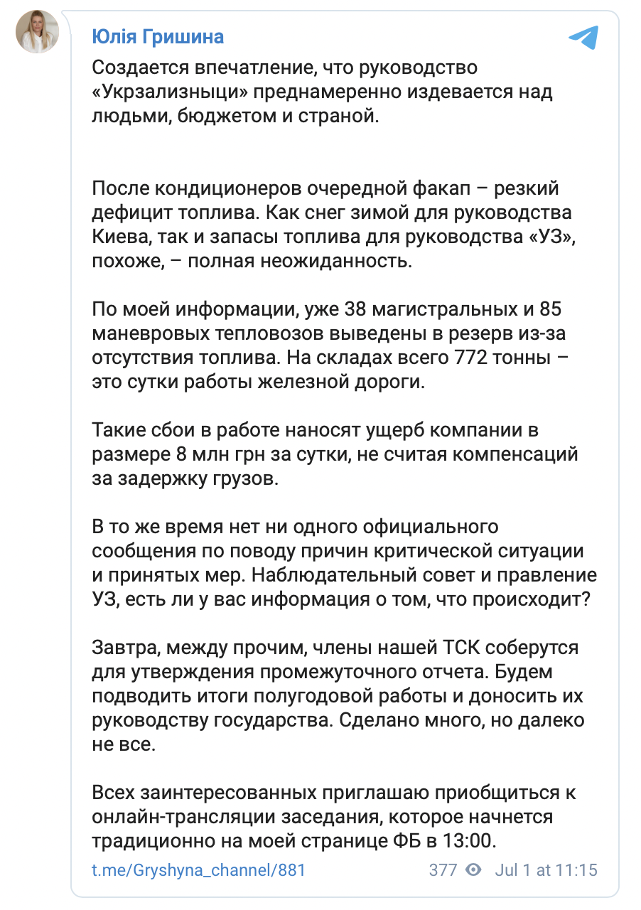 "После кондиционеров очередной факап – резкий дефицит топлива. Как снег зимой для руководства Киева, так и запасы топлива для руководства "УЗ", похоже, – полная неожиданность. По моей информации, уже 38 магистральных и 85 маневровых тепловозов выведены в резерв из-за отсутствия топлива. На складах всего 772 тонны – это сутки работы железной дороги. Такие сбои в работе наносят ущерб компании в размере 8 млн грн за сутки, не считая компенсаций за задержку грузов", - сообщила Гришина