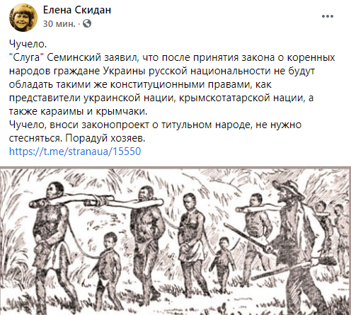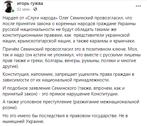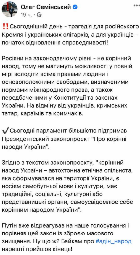 "Нардеп от "Слуги народа" Олег Семинский провозгласил, что после принятия закона о коренных народов граждане Украины русской национальности не будут обладать такими же конституционными правами, как представители украинской нации, крымскотатарской нации, а также караимы и крымчаки.