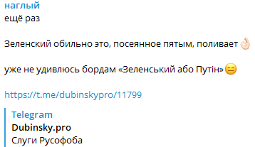 "Зеленский обильно это, посеянное пятым, поливает. Уже не удивлюсь бордам "Зеленский или Путин".