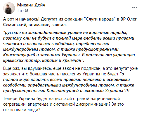 "Еще раз, вы вдумайтесь, еще закон не подписан, а это депутат уже заявляет что большая часть населения Украины не будет "в полной мере владеть всеми правами человека и основными свободами, определенными международным правом, а также предусмотренными Конституцией и законами Украины, - пишет он и спрашивает: - Теперь Украина будет нацистской страной национальной сегрегации, апартеида и системной дискриминации? За это голосовали люди?".