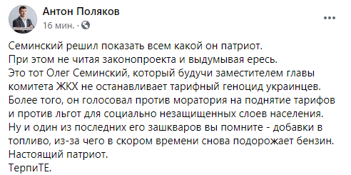 "Это тот Олег Семинский, который будучи заместителем главы комитета ЖКХ не останавливает тарифный геноцид украинцев. Более того, он голосовал против моратория на поднятие тарифов и против льгот для социально незащищенных слоев населения.