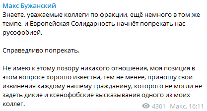 Не имею к этому позору никакого отношения, моя позиция в этом вопросе хорошо известна, тем не менее, приношу свои извинения каждому нашему гражданину, которого не могли не задеть дикие и ксенофобские высказывания одного из моих коллег", - написал Максим Бужанский у себя в Telegram.