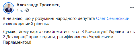 "Я не знаю, что в понимании народного депутата Олега Семинского "законодательный уровень". Думаю, ему стоит ознакомиться со ст. 3 Конституции Украины и ст. 2 Декларации прав человека, ратифицированной украинским парламентом!", - написал Трохимец и прикрепил скриншоты из соответствующих нормативно правовых актов.