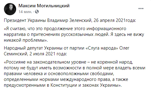 Адвокат Максим Могильницкий наряду с цитатой Семинского приводит слова президента Зеленского, сказанные им несколько месяцев назад, а именно 26 апреля 2021 года. Тогда Зеленский утверждал, что в Украине нет притеснения русскоязычных людей.