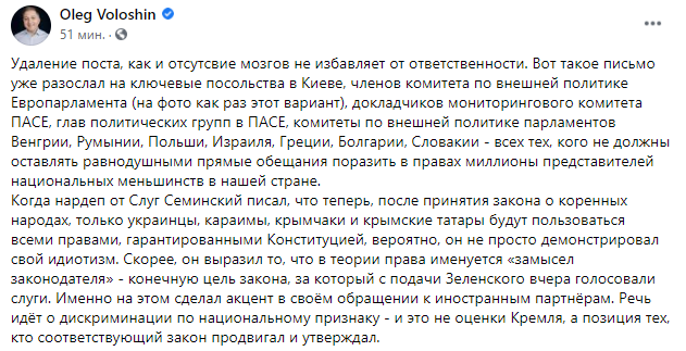 Когда нардеп от Слуг Семинский писал, что теперь, после принятия закона о коренных народах, только украинцы, караимы, крымчаки и крымские татары будут пользоваться всеми правами, гарантированными Конституцией, вероятно, он не просто демонстрировал свой идиотизм. Скорее, он выразил то, что в теории права именуется "замысел законодателя" - конечную цель закона, за который с подачи Зеленского вчера голосовали слуги. Именно на этом сделал акцент в своём обращении к иностранным партнёрам. Речь идёт о дискриминации по национальному признаку - и это не оценки Кремля, а позиция тех, кто соответствующий закон продвигал и утверждал".