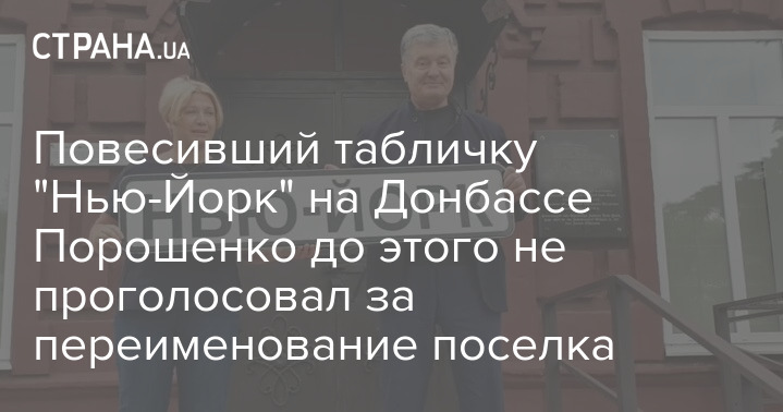 Бывший президент Украины, председатель "Европейской солидарности" Петр Порошенко не голосовал за переименование поселка Новгородское в Нью-Йорк, которое находится в Донецкой области. При этом политик накануне там побывал, продемонстрировал табличку с новым названием населенного пункта.