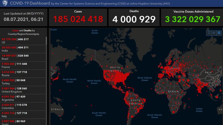 По данным на 8 июля, число зараженных на Земле перевалило за 185 миллионов, фото: университет Дж. Хопкинса