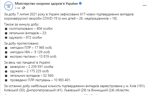 По состоянию на утро четверга, 8 июля, общее количество зараженных коронавирусом в Украине с начала эпидемии выросло еще на 617 человек.