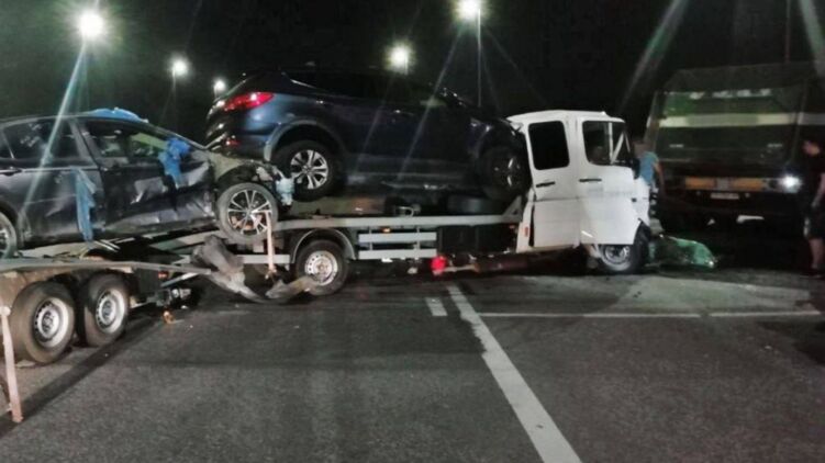 Ночью под Киевом столкнулись два грузовика. На трассе образовалась пробка в пять километров. Один из попавших в аварию грузовиков перевозил дефективные автомобили из США.