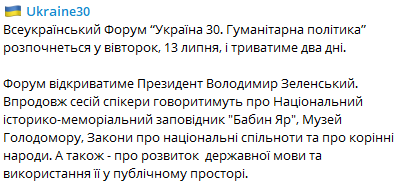 "Форум откроет президент Владимир Зеленский. В течение сессий спикеры будут говорить о Национальном историко-мемориальном заповеднике "Бабий Яр", Музее Голодомора, законах о национальных сообществах и о коренных народах. А также - о развитии государственного языка и использование его в публичном пространстве", - говорится в сообщении.
