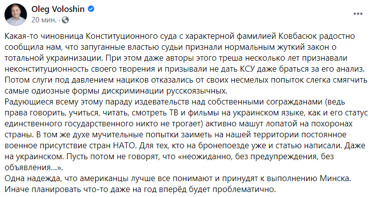 "Нет в Украине ни Конституции, ни суда. Конституционный суд признал конституционным закон о запрете русского языка. Да, этот закон — не о функционировании украинского языка как государственного, а именно — о запрете русского языка. В этом единственный смысл всего закона: запретить русский язык в Украине. Проект Анти-Россия в действии.