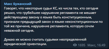 "Какая-то чиновница Конституционного суда с характерной фамилией Ковбасюк радостно сообщила нам, что запуганные властью судьи признали нормальным жуткий закон о тотальной украинизации. При этом даже авторы этого треша несколько лет признавали неконституционность своего творения и призывали не дать КСУ даже браться за его анализ.