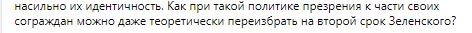 И четыре. Вот вы откровенно презираете некоторую часть своих сограждан. Не буду апеллировать цифрами, потому что я и сам ими не владею. Но очевидно, что речь идет даже не о сотнях тысячах, а гораздо больше. Вот вы их называете "русней", "ватанами", "раковой опухолью", "политическим конструктом" (последний перл от КСУ). Вы этих людей ежедневно унижаете и ломаете насильно их идентичность. Как при такой политике презрения к части своих сограждан можно даже теоретически переизбрать на второй срок Зеленского?