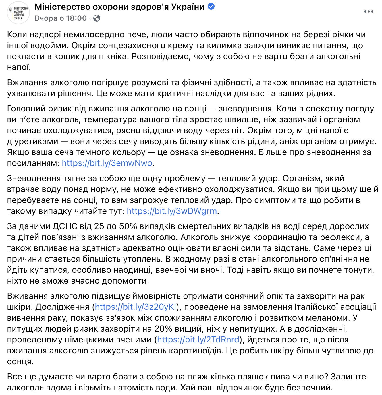 "Все еще думаете стоит ли брать с собой на пляж несколько бутылок пива или вино? Оставьте алкоголь дома и возьмите вместо него воды. Пусть ваш отдых будет безопасным", - посоветовали эксперты Минздрава.