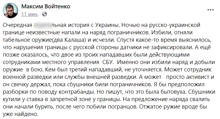 "Пишут, что это была бытовуха. Сбушники кутили у ставка в запретной зоне у границы. На предложение наряда свалить они начали бурить, после чего побили погранцов. Отжатое ружие вроде бы уже найдено", - сообщает он.