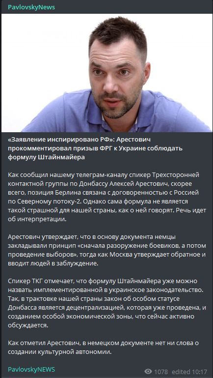 Cпикер украинской делегации в Трехсторонней контактной группе по Донбассу, внештатный советник руководителя Офиса Президента Алексей Арестович заявил, что формулу Штайнмайера уже можно считать имплементированной в законодательство Украины. Он также высказал мысль, что Россия неправильно понимает ее суть.