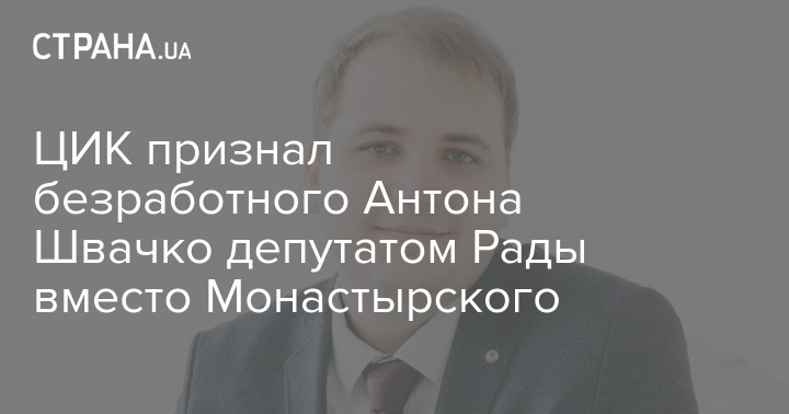 Центральная избирательная комиссия (ЦИК) признала избранным депутатом Верховной Рады от партии "Слуга народа" безработного Антона Швачко вместо Дениса Монастырского, назначенного министром внутренних дел.