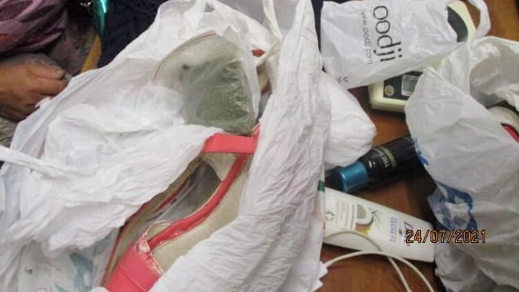 Однако во время совместного осмотра с пограничниками в личных вещах женщины нашли "полиэтиленовый сверток с веществом растительного происхождения серо-зеленого цвета весом 33,68 гр., который был спрятан в женской босоножке".