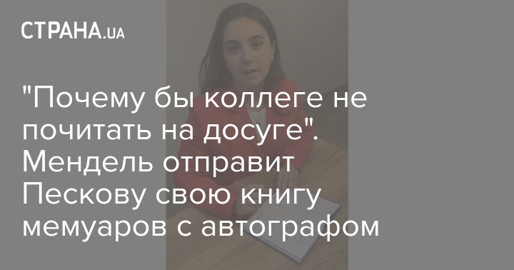 "Дмитрий Сергеевич, решила прислать вам свою книгу "Каждый из нас президент" как от бывшего пресс-секретаря президента Украины пресс-секретарю президента России. Возможно вам будет полезно узнать, что в мире существует не только ваша точка зрения", - сказала Мендель в ролике.