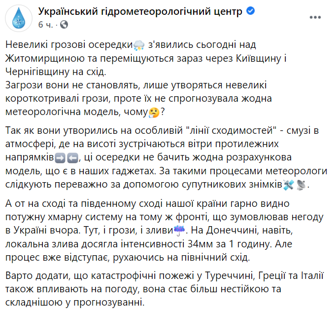 В частности, синоптики не смогли спрогнозировать грозы в Житомирской области, которые затем направились на восток в сторону Киева и Чернигова.