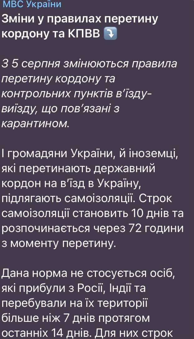Для приехавших из-за других стран, кроме РФ и Индии, украинцев и иностранных граждан, обязательно самоизоляция на десять дней (начинается она через 72 часа после пересечения границы, контролируется мобильным приложением "Вдома").