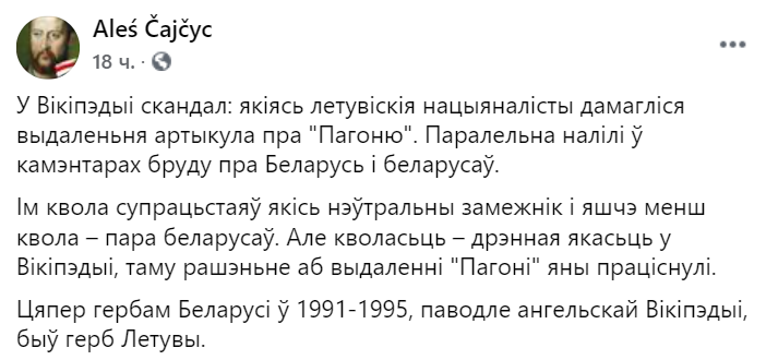 "В Википедии скандал: какие-то литовские националисты добились удаления статьи про "Погоню". Параллельно налили грязи в комментариях про Беларусь и белорусов", - написал он.