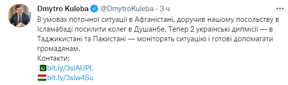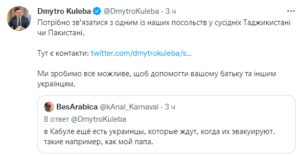 Между тем, глава МИД Украины Дмитрий Кулеба ретвитнул пост пользователя Twitter, утверждающего, что в столице Афганистана, Кабуле, еще остались украинцы, которые ждут эвакуации и заявил, что таким гражданам нашей страны необходимо обратиться в посольства Украины в соседних с Афганистаном Таджикистане или Пакистане.